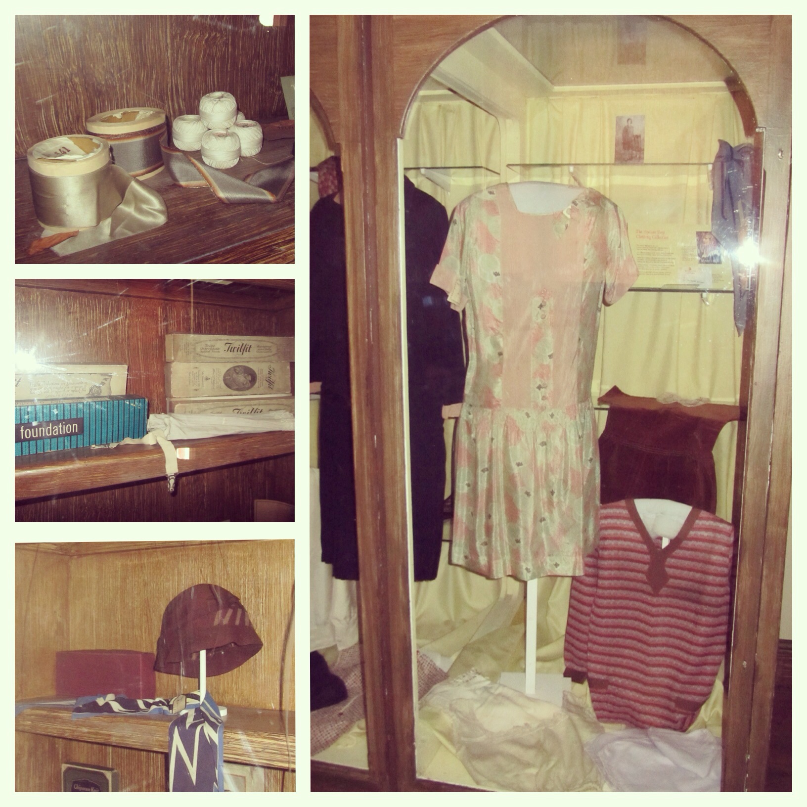 There was display case of 1920s clothing and shelves in alcoves to either side of the fireplace. In fact, the fireplace was my only real point of reference from the photograph; the display units were all new additions. The shelves held corsetry, accessories and haberdashery items – everything on display had been loaned from Walsall Museum. A door between the shop and neighbouring parlour had been filled in. The shop was accessed from the street by walking through the front door and walking a short way down a stone-floored hallway. It seemed strange for the shop to share an entrance with the rest of the house, as if the boundaries between personal and business spaces were blurred.