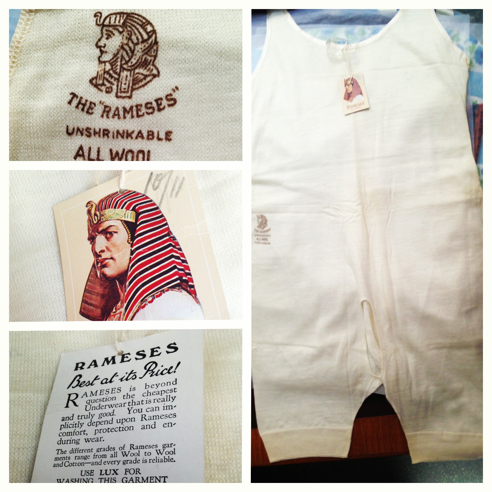 Take this 1930s woollen combination (below). It is made by the fabulously named ‘Rameses’. The first thing I noticed was the sheer weight and thickness of the fabric, I then noticed the open crotch and I have to admit that that there were giggles. To 21st century eyes, the garment has an almost comic quality. It is a world away from the ‘sexy’ briefs and bras that stuff underwear drawers across the country. In fact, it is a world away from ‘sexy’ fullstop!